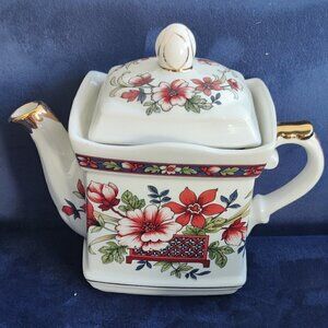 Brilliant! Gold Trimmed Teapot, 4 sided and is beautifully and extensively decorated with Red flowers and green folliage on all sides including the spout, handle and top. This teapot has no chips cracks or crazing. It has been wonderfully taken care of and I would guess displayed only.