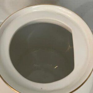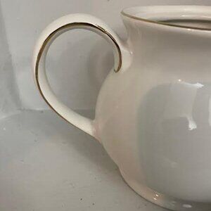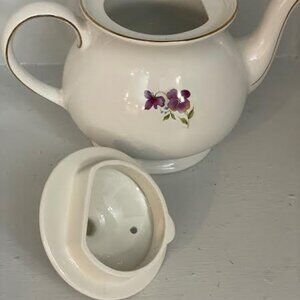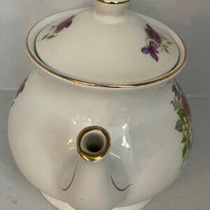 A delicate British Porcelain Teapot by Sadler. The Teapot pattern depicts a beautiful display of purple and white flowers along with tiny blue forget-me-nots on a white porcelain background and detailed with gold trim on the handle spout, rim and on the finial of the lid. The base is a footed round shape which adds to it's beauty.