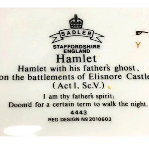 Vintage Decorative Sadler, Staffordshire England Ceramic Tea Pot. Scene from "Hamlet" by Shakespeare, of Hamlet talking to his father's ghost. Made by Sadler Staffordshire England. Vibrant colors, beautiful painting. Measures approximately 6.5" x 7.5" x 3.5" x 4.25". Light wear. Scuff marks to base. Small chip on inside lip (see photo). None of the wear can be seen while teapot is being displayed.