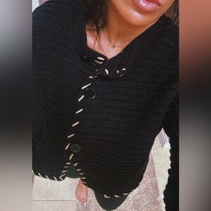 Textured knit cardigan w/ bell sleeves and contrast stitching