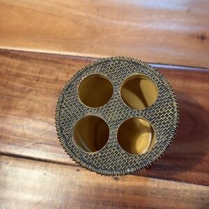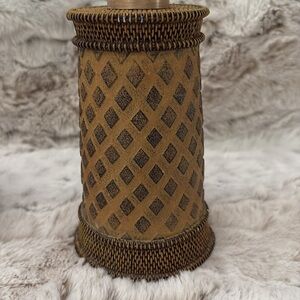 Stylish bathroom accessory set featuring a soap dispenser and a tumbler. The set showcases a brown and black pattern with intricate detailing.