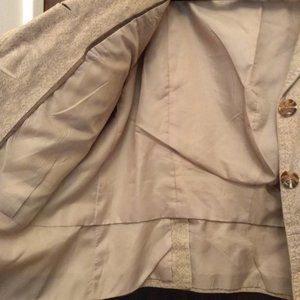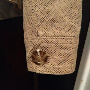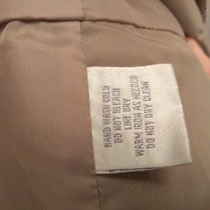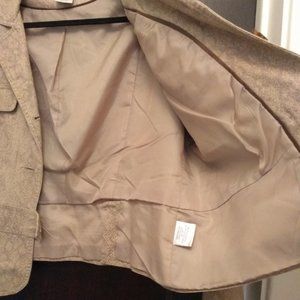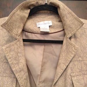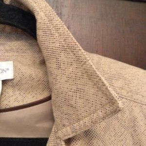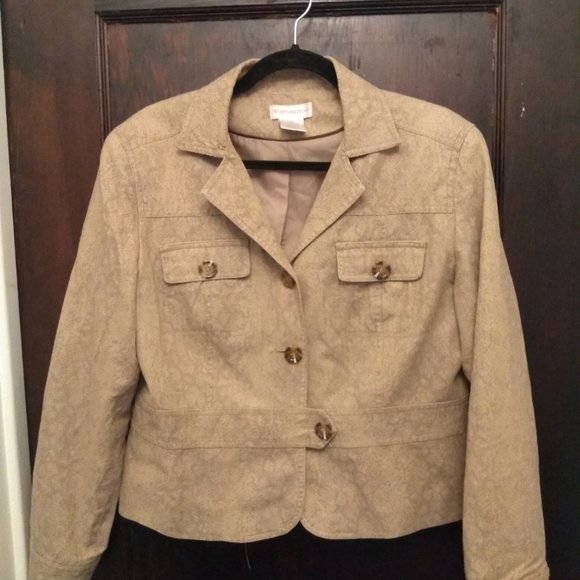 Size 14. Trendy Safari Jacket. Fully Lined. Pixelated Beige & Brown color. Machine Washable. Worthington Brand. Pair with dress pants for elegant upscale look. Pair with jeans or a boho maxi shirt for a more casual vibe. Flattering with all skin tones. Double back vents (aka twin back vents). Shoulder to cuff is 23.5 inches. Back seem measures 16 inches from shoulder to shoulder. The 2 breast pockets are functional.