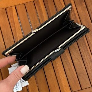 Leather Clutch ~ Complete with a framed coin pocket, card, slots, and genuine, leather construction. Shiny, silver tone hardware.