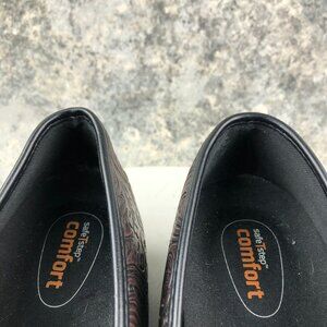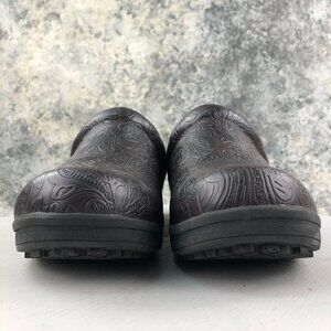 Women's dark brown faux leather tooled pattern oil and slip resistant comfort shoes, work clogs. Closed toe, non-marking sole, slip on styling.