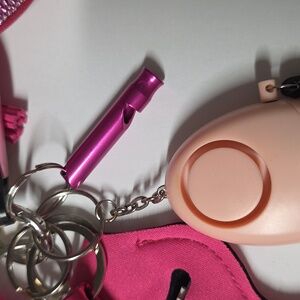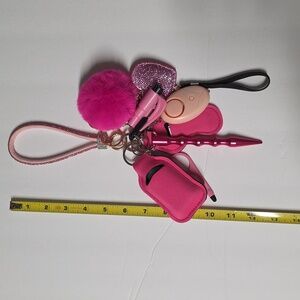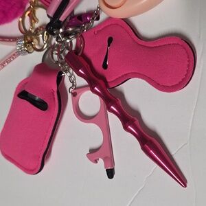 Includes: Bling wrist strap, sanitizer bottle and holder, chap/lipstick holder, whistle, glass breaker with seat belt cutter, glass breaker rod, stylus with bottle opener, Alarm (pull black strap) with loud sound and is also a flashlight, heart bling with pom.