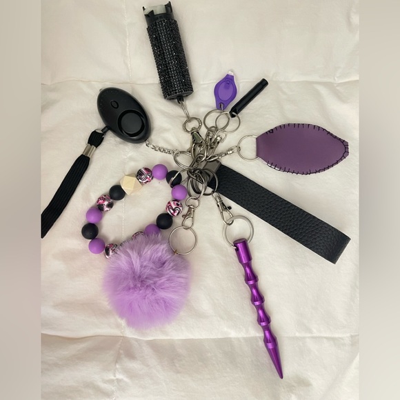 Safety keychain. Come with lanyard, silicone wrist bracelet, glass breaker, alarm, spray, whistle, chapstick holder and flashlight. To top it off a giant Pom Pom!