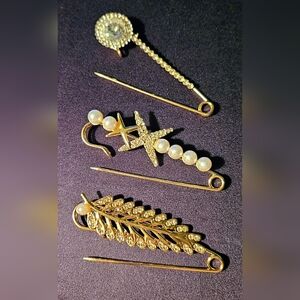 Elevate your style with these charming safety pin brooches. Each one is different and simple and adds that fun elegant touch to bags, clothing, keys, or anything you want to imagine. These fun little pins are gold tone with different faux stones and/or pearls.