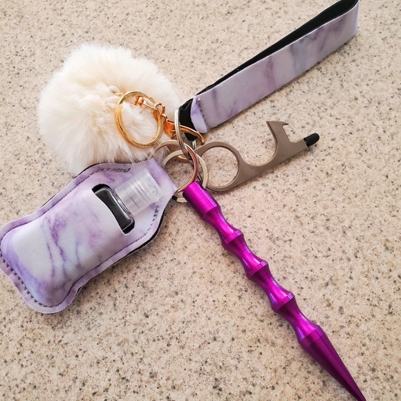 All in one key chain. Self perfection spike also use to break window in an emergency. Door opener/bottle opener. Empty flip top container to fill as desired. Soothing anxiety puff and loop handle. High school student raising money for school.