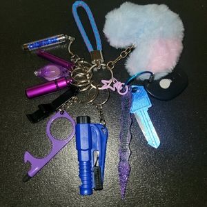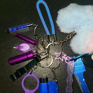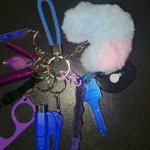 safety/convenient keys include fuzzy heart pom pom, wristlet /bear, touchless key, stylo, seat belt cutter, whistle,flashlight, mini philips and flathead set, pill holder, box/envelope opener, bottle opener, plus much more