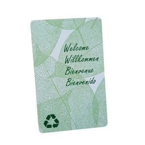 The cards feature the imprint of a leaf and Welcome in different languages.