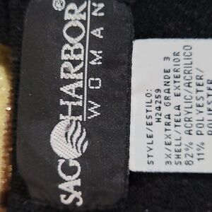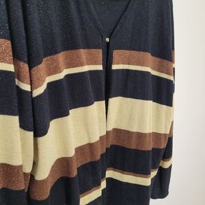 Stylish black cardigan with brown and tan shirt cardigan. Made with acrylic,polyester and Metallic materials. Beautiful colors and Sparkle. Excellent condition and quality. Tag says size 3X.