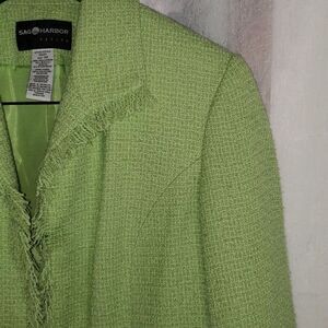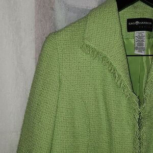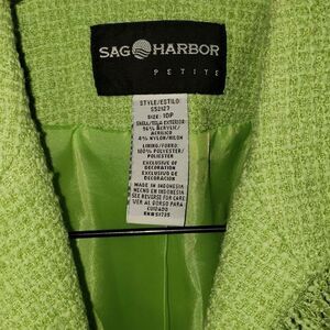This Sag Harbor blazer is a must-have for any fashion-forward woman. The bright green color and fringe accents give it a unique, vintage look that's perfect for any occasion. The jacket is made from an acrylic blend tweed fabric and lined with polyester for added comfort. It features a hook and eye closure, long sleeves, and a mid-length coat. This blazer is perfect for travel, business, or casual wear. The blazer is a size 10P and is part of the petite size type. The jacket is perfect for the fall and winter seasons. The blazer is a basic jacket style and is perfect for any theme, including Y2K, urban, vintage, 2000's, old school, millennium, kid core, 90s, retro, and streetwear.