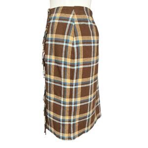Step into timeless fall style with this Sag Harbor vintage brown plaid wrap-style skirt, crafted in a warm wool-blend fabric and fully lined for comfort. The classic check pattern features shades of brown, tan, and soft blue, making it the perfect statement piece for cozy fall and winter outfits.