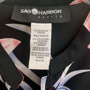Sag Harbor Floral Asian Inspired Long Sleeve V Neck High Collar Blouse - Size SP. Gorgeous and like new. Button front. Wide hem with side slits. Button detail on long sleeves.