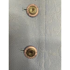 The Textured Sag Harbor Light Blue Jacket with floral pattern in Size 12 is a stylish and unique piece with its vibrant purple buttons adding a pop of color to the classic design. This blazer features long sleeves and is lined for added warmth and comfort. Perfect for a sophisticated and versatile look, this blazer is a must-have for any woman's wardrobe.