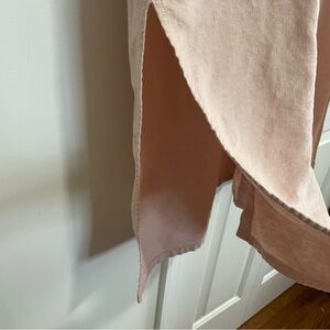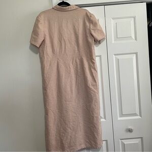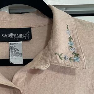 This a vintage Sag Harbor button down dress in a peachy color. The dress is a linen and cotton blend, buttons all the way down the front and the collar is embroidered with tiny blue flowers. The sides have kick splits and the dress is perfect for any comfy day!