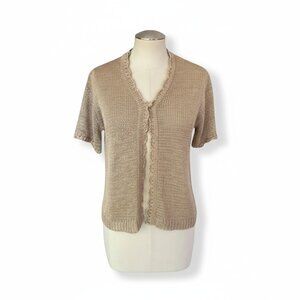 sag harbor petite cardigan, short sleeve sweater, taupe knit top, neutral layering piece, shimmer cardigan, office casual sweater, Y2K knit cardigan, vintage sag harbor style, spring layering cardigan