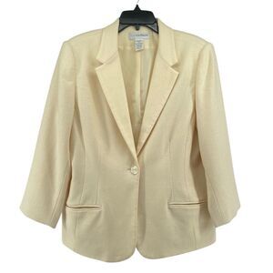 Sag Harbor Petite women’s cream wool blazer jacket, size 16P, style H62070JC, in great preloved condition. Features a single button front closure, shoulder padding, long sleeves, side pockets, and a back slit for a flattering fit. Fully lined for comfort and structure.