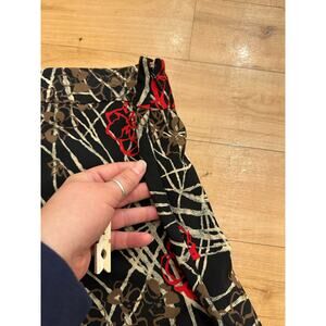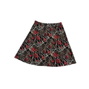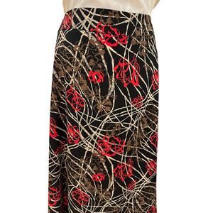 90s Sag Harbor plus sized midi skirt. This black skirt with cream, red and light brown floral print has a dark sophistication. It's all poly, has a side zipper and is a simple A-line structure. Marked a size 16. I'm a modern 14/16 depending on the brand and this fits me worn a little high waisted. Waist measures 36" and the length is 28".