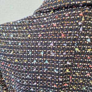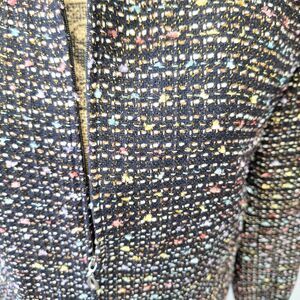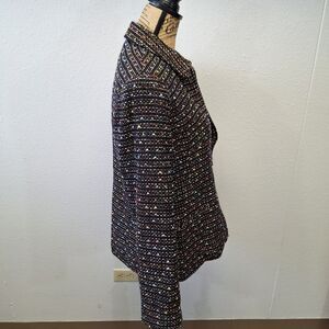 Sag Harbor Tweed Jacket. This mid-length jacket features a solid multicolored pattern, long sleeves, and a zip closure. The outer shell is made of acrylic tweed fabric, and the jacket is lined for added warmth. The jacket is perfect for travel, casual outings, or business meetings. It comes in a regular fit and is available in women's size 10. The jacket has a regular size type and is made in Vietnam. The jacket is dry clean only and is perfect for the fall, winter, and spring seasons. The jacket has shoulder pads and accents of a zipper. Vintage lovers will appreciate that this jacket is not vintage and that it has no personalization features.