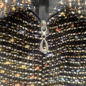 Elevate your wardrobe with this timeless Sag Harbor zip-up jacket in a richly textured multicolor tweed. Features subtle metallic threading for a hint of shimmer, a full front zipper with a decorative teardrop pull, and two front slit pockets. Perfect for work, church, or dressy casual occasions. Size 16 with a flattering tailored fit.