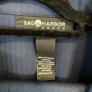 The Sag Harbor Two Piece Jacket Pant Suit in navy blue is a stylish and versatile outfit for women in size 12. The suit is unlined, making it lightweight and perfect for summer, fall, and spring seasons. The jacket features a striped pattern, notch lapel, and a three-button front closure, while the striped pants have a regular fit and a 30-inch inseam. This pant suit is suitable for various occasions, including weddings, parties, casual outings, and business events, offering a classic and timeless look with a touch of vintage elegance. Easy to care for with machine washable fabric, this suit from Sag Harbor is a must-have for any fashion-forward woman's wardrobe.