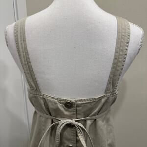 Features: Cotton twill fabric; adjustable buttoned shoulder straps; front bib pocket; tie-back waist for adjustable fit; back button closure; midi length