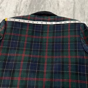 Vintage green , red and metallic gold plaid suit jacket is fully lined, velvet collar, one button front closure , front pockets (still sewn shut) and shoulder pads.