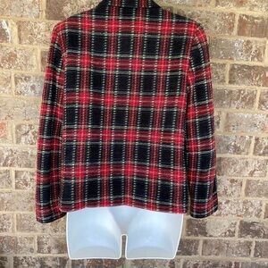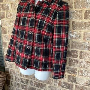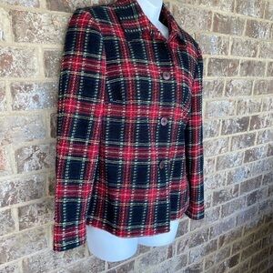 Vintage Sag HarborTartan blazer size 10. Armpit to armpit measures 19 inches. Sleeve length 22 inches. Shoulder to hem line 24 inches. Shell 100% acrylic. Lining 100% polyester. Buttons down front.
