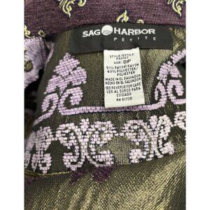 The Sag Harbor Vtg Purple & Multicolor Jacket Coat in size 8P is a button-up retro tribal design perfect for women who love a unique and stylish outerwear piece. Made of rayon with a geometric pattern, this long sleeve jacket features a vibrant purple color and a retro theme that adds a touch of nostalgia to any outfit. The brand Sag Harbor ensures quality and style, making this jacket a standout piece for any wardrobe.