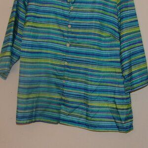 blue green yellow small stripes running across in a kind of abstract way , 3.4 sleeves botched at cuffs , button down with loops, 100% Polyester , Good pre owned condition no holes stains or aggressive wash wear, size 22W measurements are roughly 28" from shoulder to hem and about 26" pit to pit, pet friendly non smoking home.