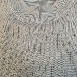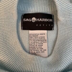 Sag Harbor Women's Petite Medium Light Blue Metallic Ribbed Sweater Short Sleeve Mock Neck. Tight Knit acrylic fabric with metallic thread accents. In Excellent condition. No stains or tears.