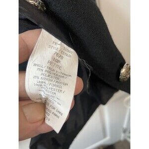 Elevate your wardrobe with this Sag Harbor black blazer, perfect for any occasion from travel to workwear. The mid-length coat is made from a polyester blend material with a solid weave pattern. The blazer features a 2 button closure and accents for a classic and timeless look. This women's petite size 10 blazer from Sag Harbor is versatile for all seasons, whether it's winter, summer, fall, or spring. The lining material is polyester and the fabric type is a weave. Perfect for a casual or business outfit, this basic jacket is a must-have for any wardrobe.