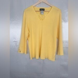 Elegant yellow sweater by Sag Harbor. Features a delicate lace V-neck design.
