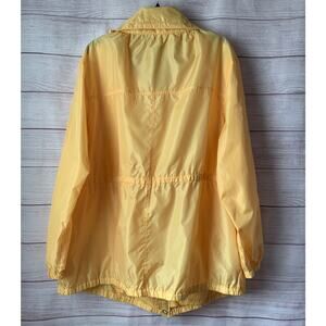 Yellow windbreaker jacket by Sag Harbor. This jacket has a snap button up front. The neckline can fold down like a collar or snap button-up to provide more protection from the elements. There is a cinch tie-string in the rim of the neckline and a cinch tie-string around the waist. Both tie-string locations have metal adjustor pieces. The button and metal detail are in gold. The jacket has slit pockets at the bottom. The long sleeves and the very bottom of the jacket have an elastic band. It is pre-owned and in great condition.