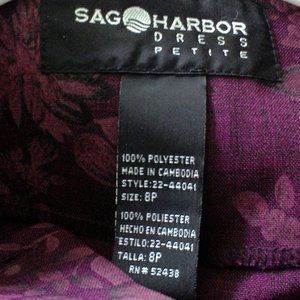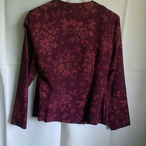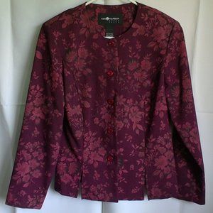 Sag Harbor deep rose flowered fitted jacket with shoulder pads (which could be removed). 5 buttons down front. 100% polyester. Made in Cambodia. Machine wash cold, delicate cycle; tumble dry low. Approximate measurements: 15.5" across the shoulders; 22" sleeve length; 22" neckline to hem length. In excellent condition.