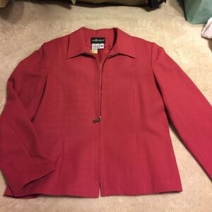 Sag Harbor wool blazer.  Zip front rather than buttons, Slit pockets on side seam gives a really clean look.  Collar, no lapels. Deep coral.  Freshly dry cleaned.  Great layering piece!  chest 44",  bottom hem across measures 24" and sleeve length from top of shoulder to cuff is 24"  EUC.