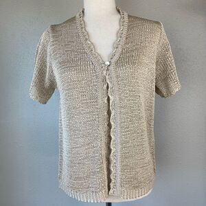 Super cute and classic cardigan measuring19 inches armpit to armpit laying flat and 21 inches in length from shoulder to hem.