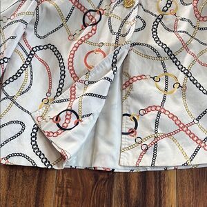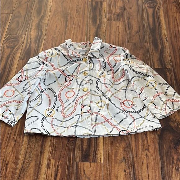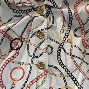 Chic button-up jacket with a striking chain pattern. Features orange, black, and gold accents. 3/4 sleeves. Preowned.