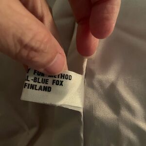 A classic BLUE FOX STROLLER jacket coat ... and a wonderful "first" fur coat for someone! Pretty IVORY WITH GRAY/GREY TIPS hip-length FOX FUR JACKET. Classic cut. FOX is a LONG FIBER, incredibly SOFT AND THICK fur. All fox fur coats are made with strips of fur joined by strips of leather. Generously cut arm holes for ease of movement. The long sleeves are straight, no cuffs, no elastic at the wrist. The fur is in VERY GOOD condition ... no smells, no tears, no shedding. The jacket features deep-cut arm holes, heavy-duty furrier's hook/eye front closures and 2 front slip-in pockets. Lining is in EXCELLENT shape with no holes, no stains or discolorations.
