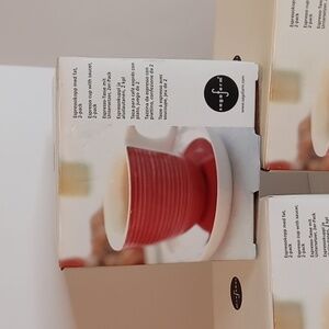 What a wonderful bunch of teeny cups. The red and cream swirl pattern is so pretty and be hand painted. There are two mugs and two saucers in each box which have never been used. Sagaform is the brand and the design is by SDG Sweden. The saucers are marked on the bottom. The one finger handle reminds me of a nice little brunch with the girls. Very dainty. These are very small as you can see by the pictures. Scotch tape is in a few to show size. Soooo cute! The cups are about 1.75" tall and 3.25" wide. The saucer is a little over 4.25" wide. There are no chips or cracks or any issue. Could use or display them.