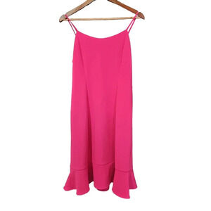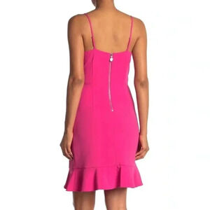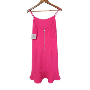 Sage Collective Scuba Crepe Mini Dress in Bright Fuschia. Size 2. Features scoop neckline, sleeveless, spaghetti straps, exposed back zip closure, ruffle hem, scuba crepe fabric, mini length, and lined. Style ST01K29H. Shell: 95% Polyester, 5% Spandex. Lining: 100% Polyester. NWT / New with tags.