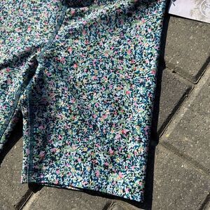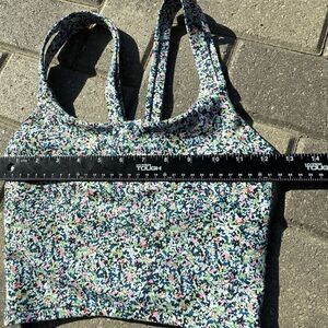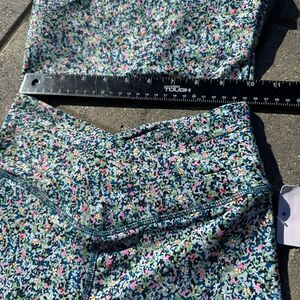 The Sage Collective Set includes a sport bra and biker shorts in a floral blue static ditsy pattern. 2-piece set, size XS. pullover closure, back cross, lined sports bra. Bike shorts, 7 inch inseam, crossover waist.