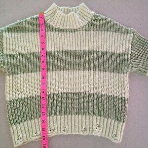 Sage & Cream Chunky Striped Knit Sweater – Mock Neck, Distressed Hem (Size M)