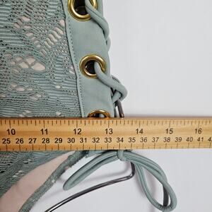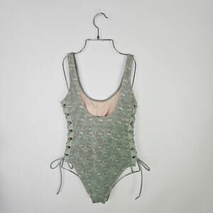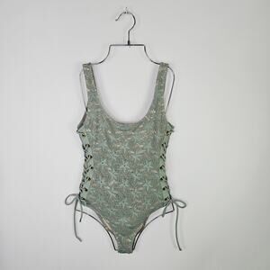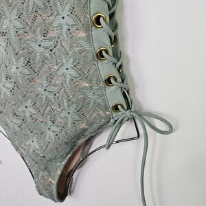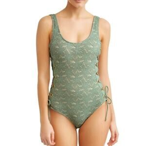 Sage Green Crochet Lace One-Piece Swimsuit Nude Lining Sexy Lace Up Side Medium