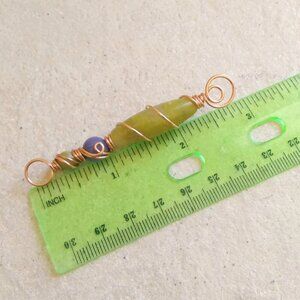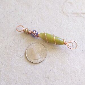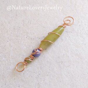 Unique and one-of-a-kind Wand or Scepter Pendant - created with semi-precious stone beads - from top to bottom: sage green round Jasper bead + purple/blue Jade bead + sage green elongated Jasper drum bead. Wire wrapped with natural copper jewelry wire. Large loop bail accommodates any size chain, sari silk or leather cordage.