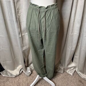 These sage green trousers boast a relaxed fit and a high-waisted paper bag style, offering both comfort and a chic appearance. Crafted from a lightweight, textured fabric, they are perfect for a casual day out or a laid-back evening. The adjustable waist ensures a personalized fit, making them a versatile addition to any wardrobe.