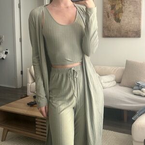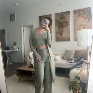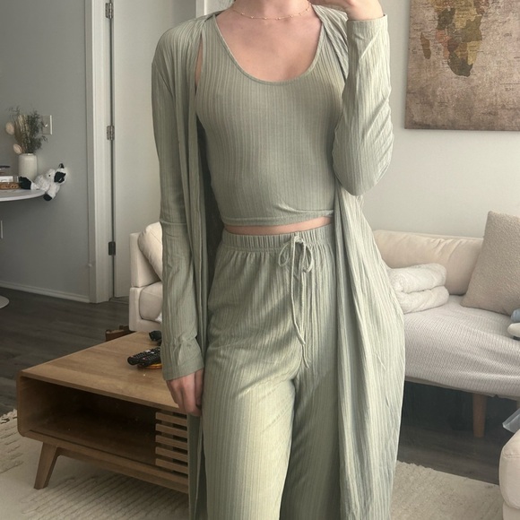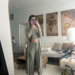 Stylish sage green ribbed lounge set. Includes a tank top, pants, and long cardigan. Perfect for a cozy day at home, grabbing coffee/running errands, going to class, etc. love this set, looks super put together & cute 😊