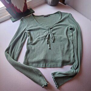 Sage Green Ribbed Tie-Front Long Sleeve Top – Cropped & Flattering