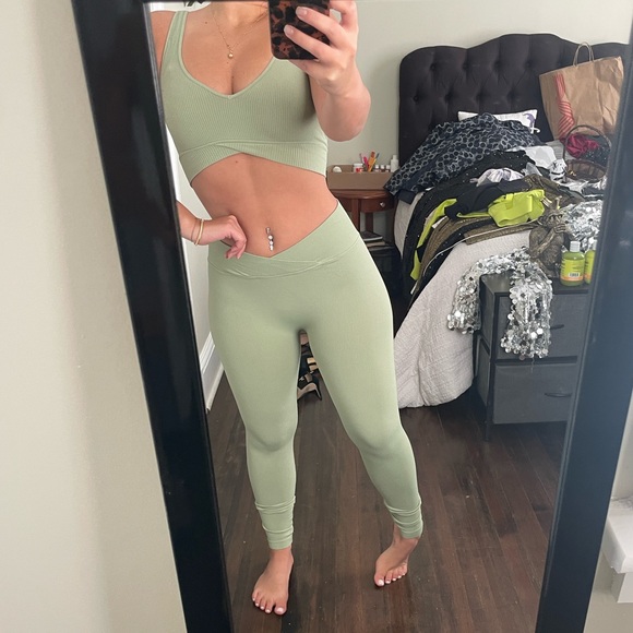 Stylish sage green ribbed bralette and leggings. Super comfortable and cute for working out or just a shopping day out